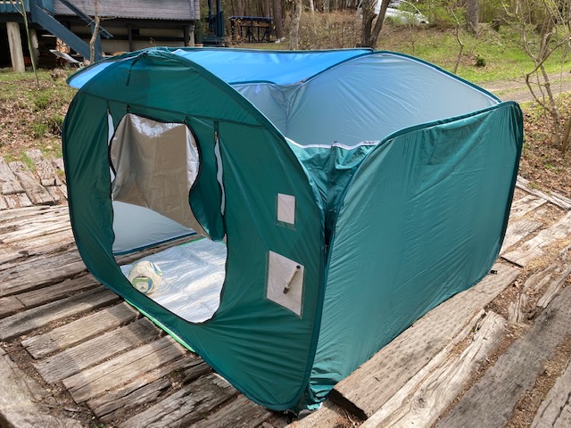 サイズは展開時2.1m×2.1m、収納時70cm×70cm×8cm(4.9kg)。弾力性がある支柱の力で、広げるだけで形になり自立するタイプです。(下に敷くアルミシート、取り外し式の屋根(片側分)、使用者表札プレート&記入用マジック等が付属)